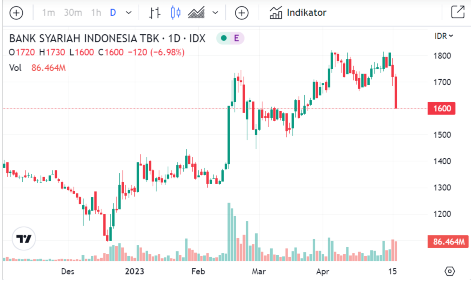 Harga saham bank BSI telah anjlok mencapai 11,60% dari Rp1.810 menjadi Rp1.600 dalam dua hari terakhir. (alfi)