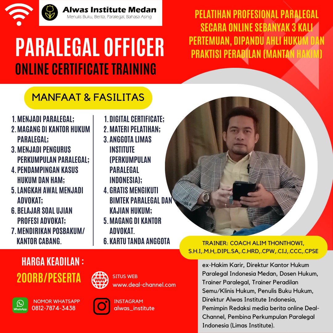 DEAL KURSUS | Pelatihan paralegal ke depan akan mengarah pada kemampuan teknis dan akademis, hal itu disampaikan oleh Sekretaris Kantor Hukum Paralegal Indonesia kota Medan M. Syahri Ramadhan Saragih kepada www.deal-channel.com pada pekan lalu.