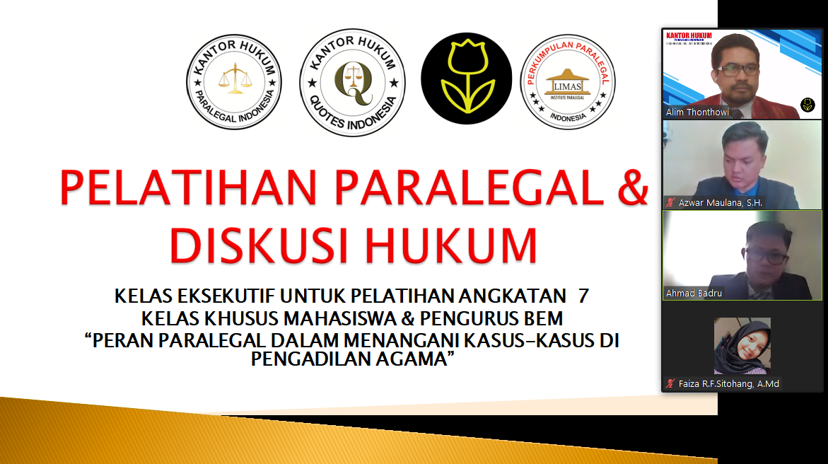 DEAL MEDAN | Alwas institute kembali melaksanakan kegiatan pelatihan paralegal online angkatan 7, acara itu dimulai hari ini, Kamis (16/11) pagi hingga siang ini langsung dari kantor hukum paralegal Sumatera Utara di Medan.