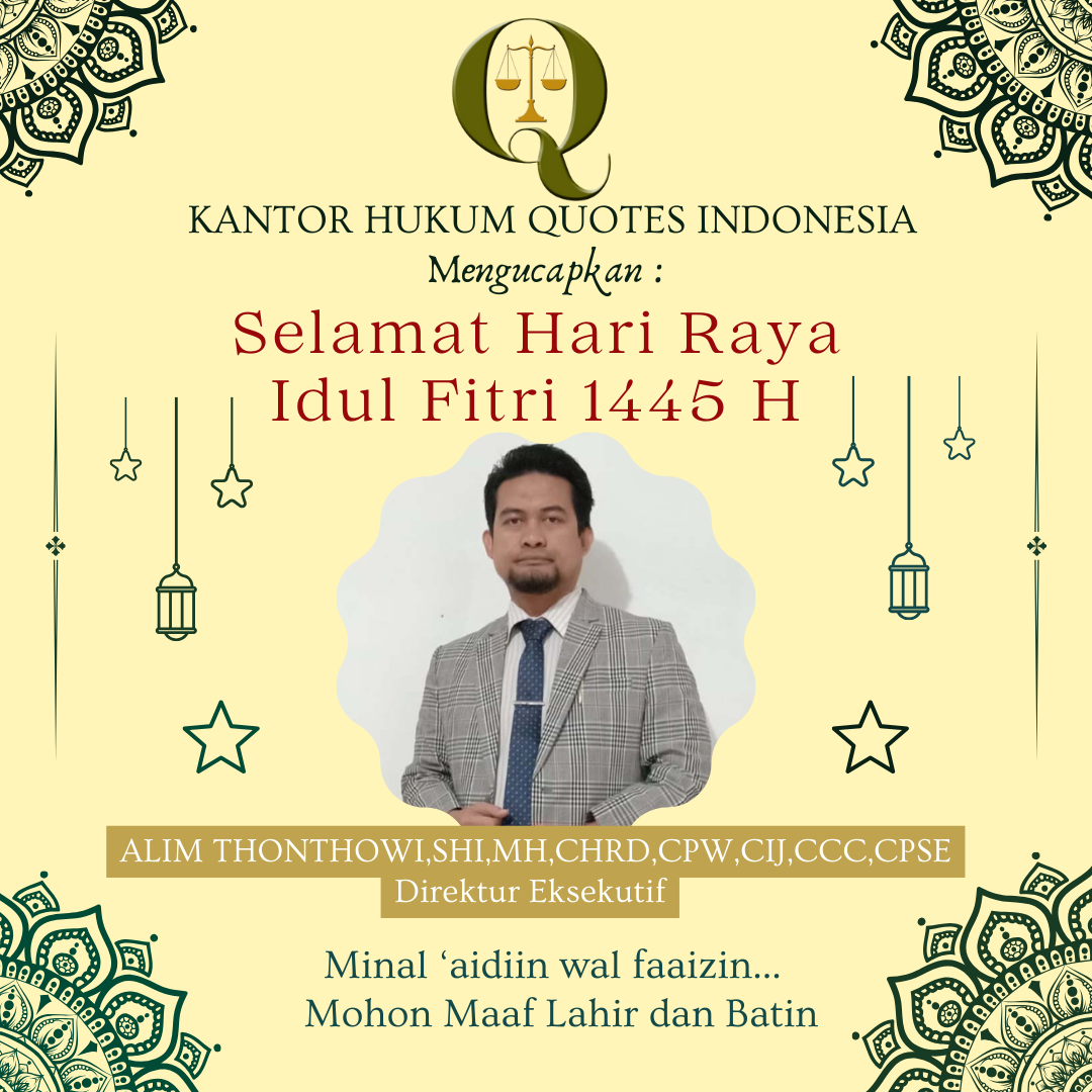 Dalam semangat kebersamaan dan persaudaraan, Direktur Eksekutif Kantor Hukum Quotes Indonesia, Bapak Alim Thonthowi, memberikan sambutan yang penuh makna menyambut Hari Raya Idul Fitri 1445H. Dalam sambutannya, beliau menyoroti pentingnya momen ini sebagai momentum untuk memperkuat hubungan antarpegawai, klien, dan masyarakat umum.