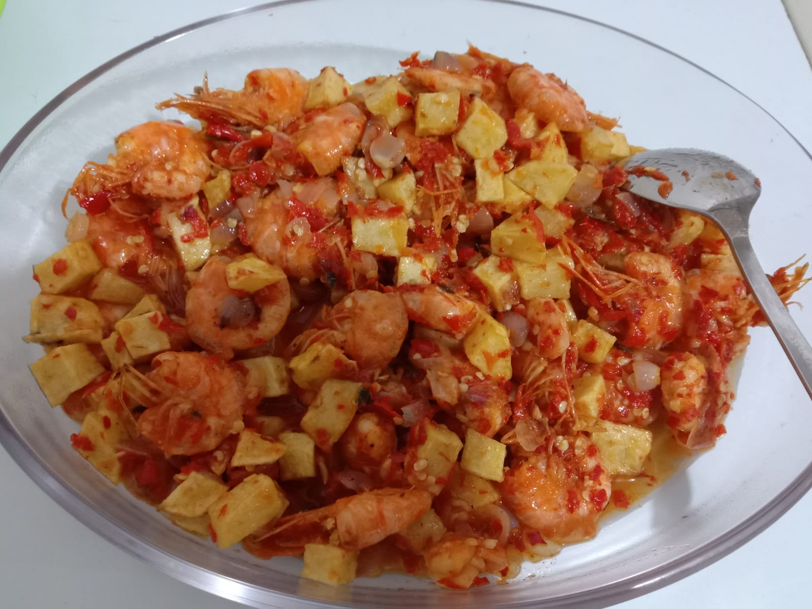 Sambal udang kentang menawarkan sensasi rasa yang unik dan memikat. Udang segar yang dimasak hingga matang sempurna memberikan rasa gurih alami, sementara kentang yang dipotong dadu menambah tekstur lembut pada hidangan ini. Tidak hanya itu, sambal yang dibuat dari campuran cabai merah, bawang putih, bawang merah, tomat, dan rempah-rempah khas Indonesia, menciptakan rasa pedas yang pas dan aroma yang harum menggoda.