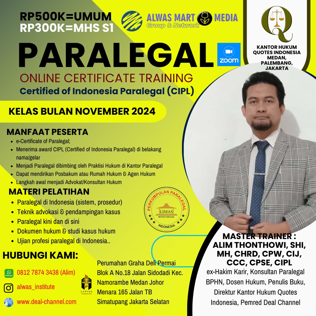 DEAL KURSUS | Semakin kompleksnya permasalahan hukum yang dihadapi masyarakat, kebutuhan akan tenaga paralegal yang terlatih semakin mendesak. Para profesional hukum, termasuk pengacara, hakim, dan notaris, membutuhkan dukungan dari paralegal yang memiliki keterampilan dan pengetahuan dasar hukum yang memadai. Salah satu lembaga yang menawarkan solusi pelatihan paralegal dengan cara yang inovatif adalah Alwas Institute. Dengan program pelatihan paralegal online yang terjangkau dan fleksibel, Alwas Institute telah menarik minat banyak peserta dari berbagai latar belakang, baik yang sudah berkarir di bidang hukum maupun mereka yang baru ingin memasuki dunia hukum.