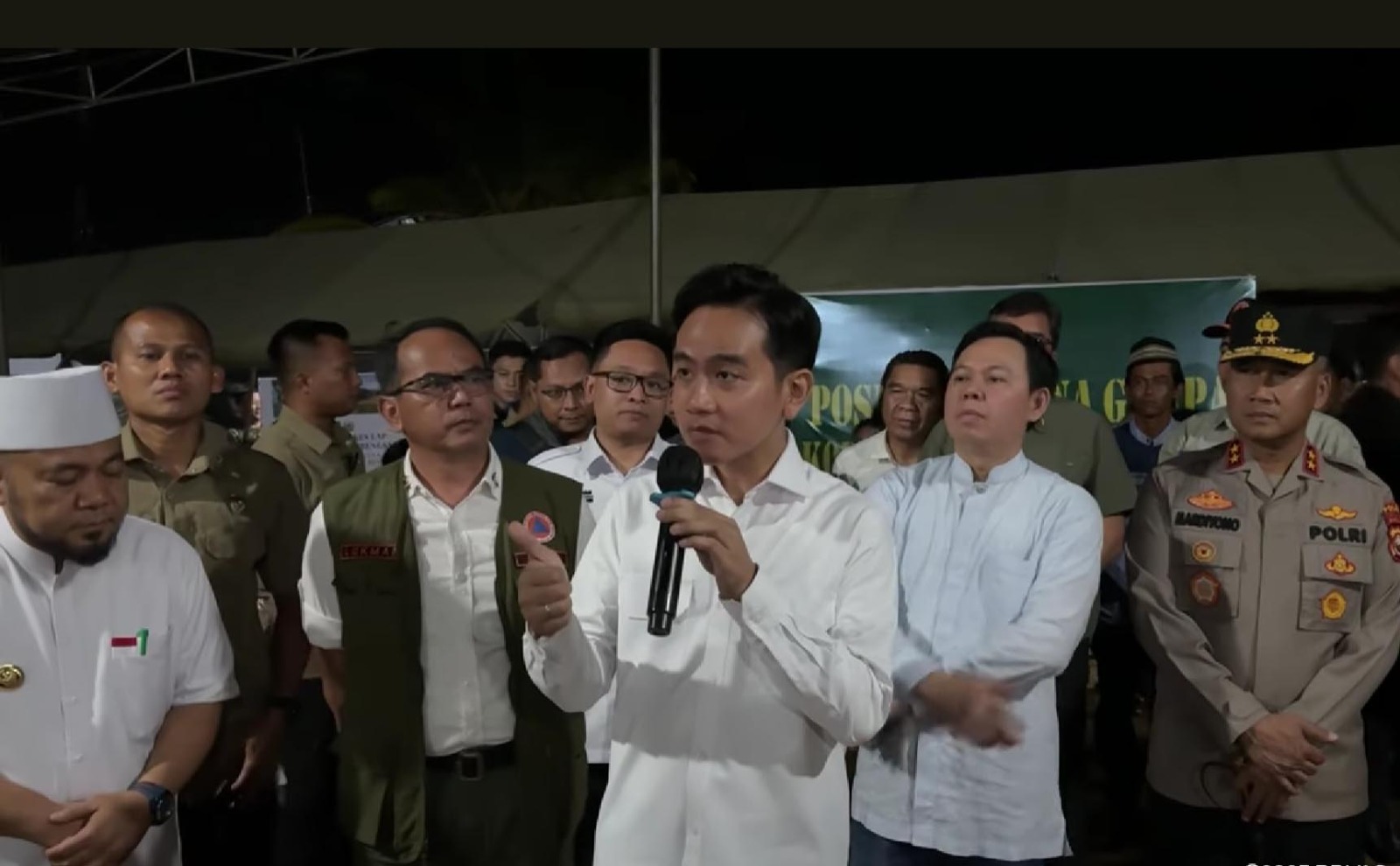 Di hadapan ratusan pengungsi yang duduk di tikar plastik, sebagian masih dalam pakaian seadanya, Gibran berdiri dengan jaket cokelat khas lapangan. Suara mikrofon terdengar tegas namun bersahaja.